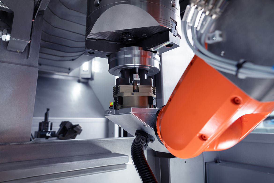 An industrial robot precisely inserts a workpiece into the spindle of an EMAG vertical turning machine.