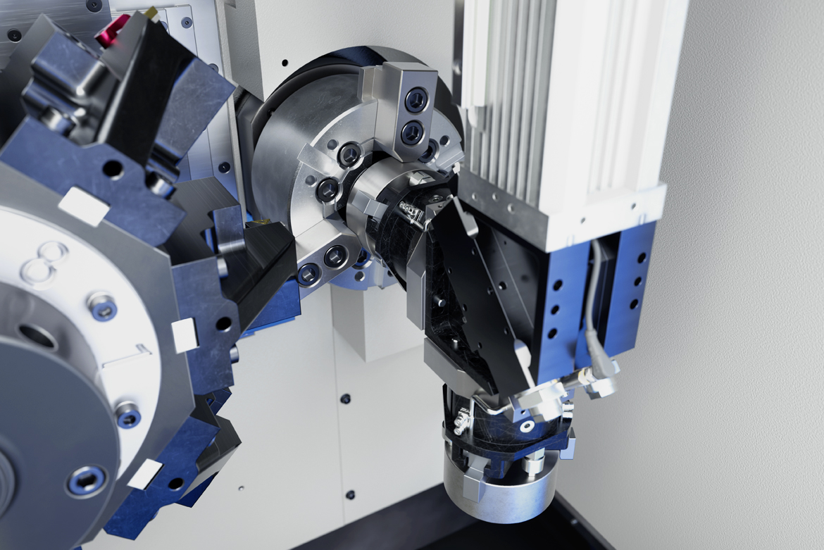 The two servo-controlled turrets, each with 8 tool positions, are the heart of the machine. The BMT interface allows it to accommodate boring bars with a diameter of up to 40 mm for internal machining and tools with a shank of 25 x 25 mm for external machining. The servo-controlled indexing in combination with hydraulic clamping enables short tool change times with high positioning accuracy.
