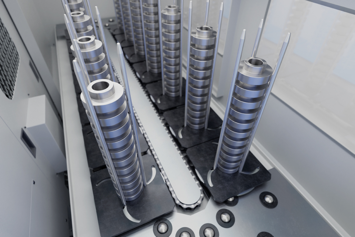 Otro aspecto importante es nuestro compacto sistema de almacenamiento por apilado, que se integra directamente en la máquina. Este sistema de apilado de piezas en bruto y terminadas no requiere espacio adicional y puede adaptarse con flexibilidad a diferentes geometrías de piezas. En función del tamaño de la pieza, se pueden almacenar piezas suficientes para varias horas de producción autónoma, lo que es especialmente importante en la producción con poca mano de obra.