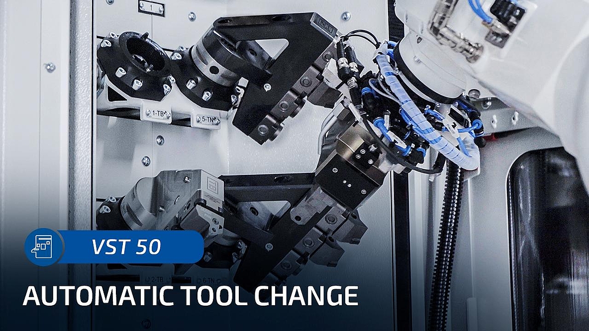Los cambios de herramientas se realizan a gran velocidad en la VST 50, con una pantalla en el sistema de control que informa al operario de los próximos cambios de herramientas. Para insertar las herramientas, el operador simplemente pulsa un botón y el almacén de herramientas totalmente automático gira hacia fuera para el cambio; el proceso de producción no se interrumpe mientras tanto. El cambio de herramienta en el interior de la máquina lo realiza uno de los robots: en menos de 90 segundos, retira la herramienta desgastada del interior de la máquina y la sustituye por una nueva, que toma del almacén.